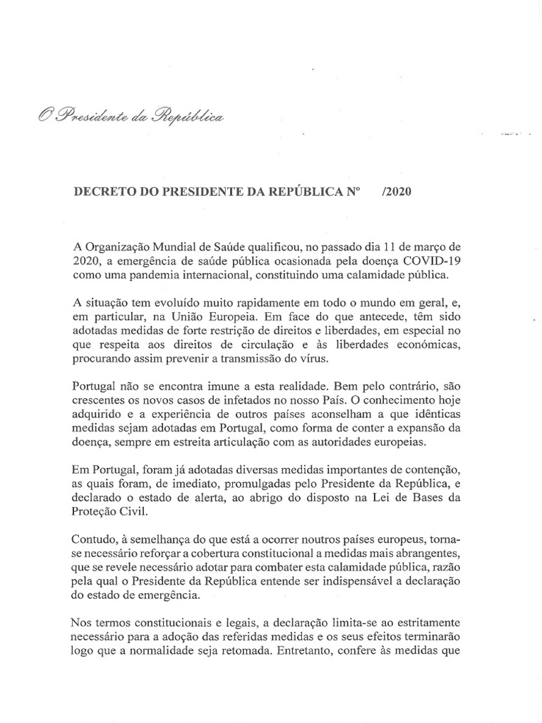 O presidente da república, após ouvir o conselho de estado por videoconferência, vai decretar o estado de emergência. Leia aqui o decreto publicado pelo presidente da república, marcelo rebelo de sousa. Los diputados de arena y del fmln, se mostraron indiferentes a prorrogar el estado de emergencia que vencía el sábado 16 de mayo a las cero horas. Covas disse que está fazendo um levantamento de crianças em situação de vulnerabilidade social e meios de garantir a oferta de refeições a elas. Todos os serviços que necessitam de gasolina foram suspensos, fora coleta de lixo, transporte público e ambulâncias.